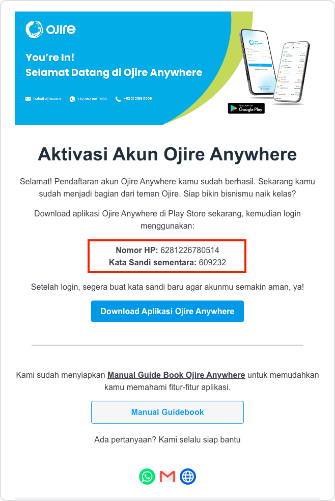 Dapatkan informasi Merchant ID dan Kata Sandi Sementara kamu melalui email dari Customer Care Ojire (customer.care@ojire.support).