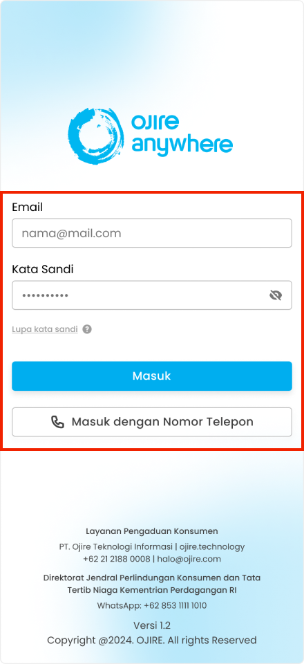 Login aplikasi Ojire Anywhere menggunakan kata sandi yang sudah kamu terima.