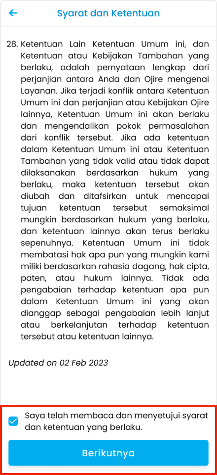 Baca syarat dan ketentuan yang muncul lalu tap centang untuk menyetujuinya.