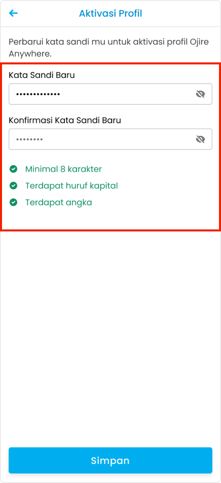 Di halaman aktivasi profil, buat kata sandi baru lalu tap Simpan.