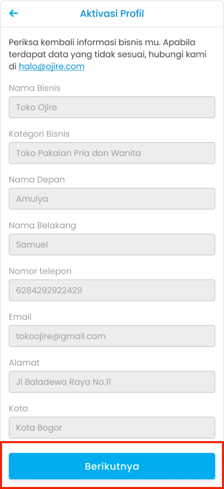 Cek kembali informasi bisnismu, jika semua data suda benar, tap Berikutnya.